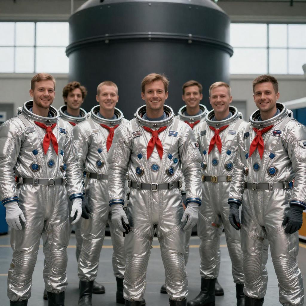 Photograph of seven men in silver space suits with red neck scarves, standing in a row. They have short hair and smile. Background includes a large, cylindrical black object and large windows. Men wear black belts and gloves.