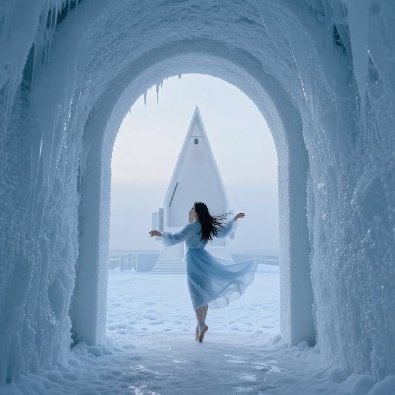 Photograph of a woman with long dark hair, wearing a flowing white dress, standing in a snow-covered, ice-arched tunnel. She is mid-leap, arms outstretched, with the icy texture of the tunnel framing her. Beyond the arch, a white, triangular-shaped building is visible in a misty, snow-covered landscape. The image is bathed in a cool blue light, enhancing the icy, ethereal atmosphere. The woman's dress and hair create dynamic, flowing contrasts against the rigid ice.