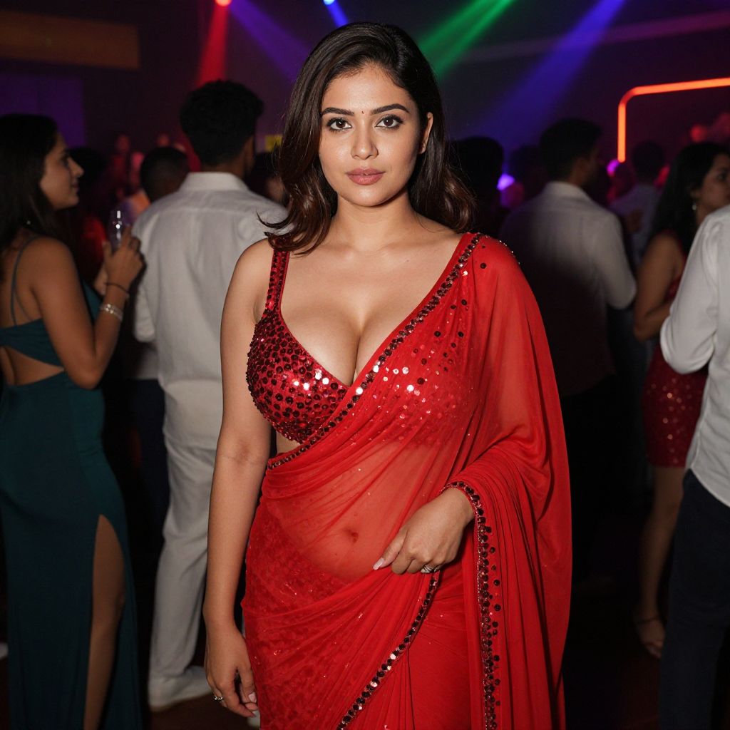 Photograph of a young South Asian woman with medium-dark skin and long, wavy black hair, standing in a dimly lit, colorful nightclub. She wears a vibrant red saree adorned with shimmering sequins, featuring a deep V-neck that reveals her cleavage. Her right hand holds the saree's edge at her waist. The background is blurred, showing other partygoers in dark and light clothing, with multicolored lights creating a festive atmosphere. Her expression is confident and slightly smiling, with subtle makeup accentuating her features. The overall scene conveys a lively, glamorous party setting.