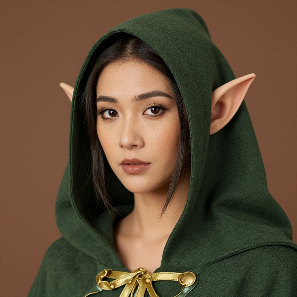 Digital portrait of a young Asian woman with elf ears, wearing a dark green hooded cloak with gold ties, against a brown background.