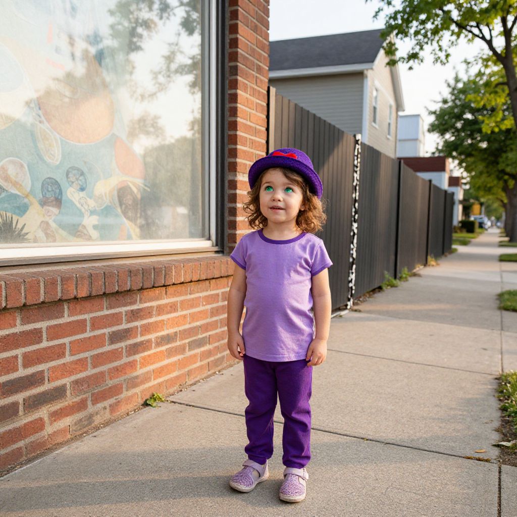 A young child, around 5 years old, with curly brown hair and bright green eyes, is wearing a colorful purple outfit featuring a purple shirt, purple pants, and a purple hat with a small red bow. The child is standing on a sunny sidewalk in front of a brick building with a large window displaying a faded mural on the inside, and a tall black fence with a few cracks running along its edge. The scene is set in a small neighborhood during early afternoon, with soft sunlight casting gentle shadows and a few trees in the background. The child is looking slightly upward, as if gazing at the sky or a distant figure, with a curious and joyful expression on their face.