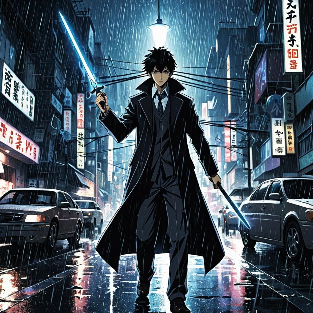 An enigmatic psychic detective, wielding a psychic energy manifested as sharp blades, engaging in deciphering mysterious clues amidst chaos, set in a rain-soaked metropolitan street at midnight, depicted in the intense and action-packed anime style of Sui Ishida.
