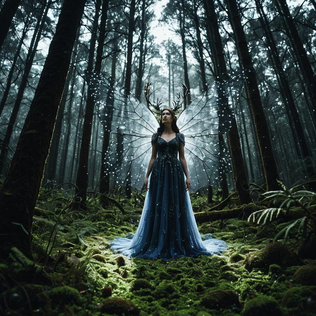 Fenrick, a brooding ranger in a pine forest, surrounded by pine cones, dry leaves, crow feathers, and fractured bark. Styled as a dark botanical scene captured from a bird's-eye view in a medium shot, with hyper-detailed, hyperrealistic rendering. The scene has a double-exposure effect and is captured in high resolution (10240k) with an ISO 9000 setting. Rendered as a RAW photo with high dynamic range, utilizing lumen, octane, f/32, and 1/600s for ultra-HD quality. Captured with a 30mm lens in a 3D CGI style, resulting in a dark, detailed forest atmosphere.