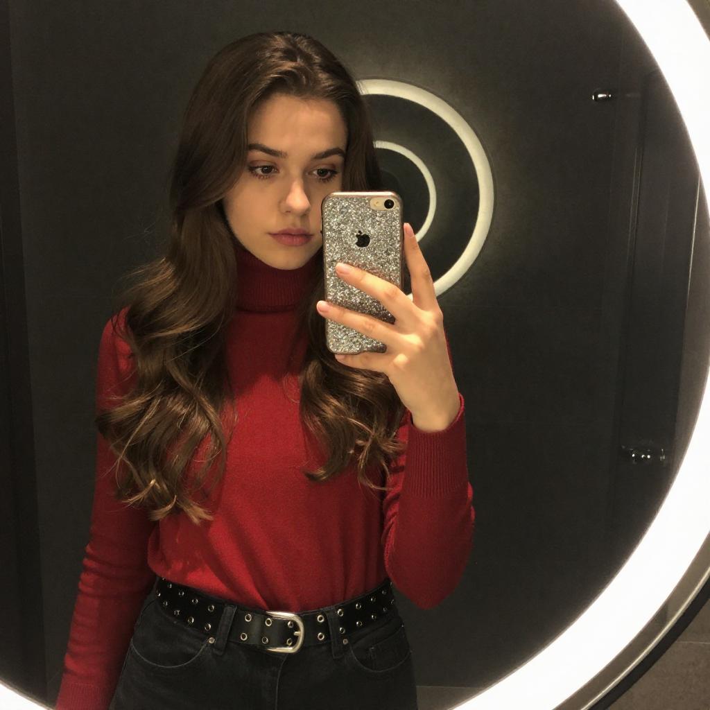 Photograph of a young woman with long brown hair, smiling, taking a mirror selfie with a red phone. She wears a black graphic t-shirt and blue jeans, standing in front of a wooden door. The mirror reflects her upper body, and the countertop is visible at the bottom.