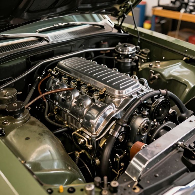 Close-up of a 75 Dodge Challenger's engine bay with polished chrome parts and vintage mechanical components, detailed textures showing grease and metal, workshop background with steady warm lighting highlighting car craftsmanship