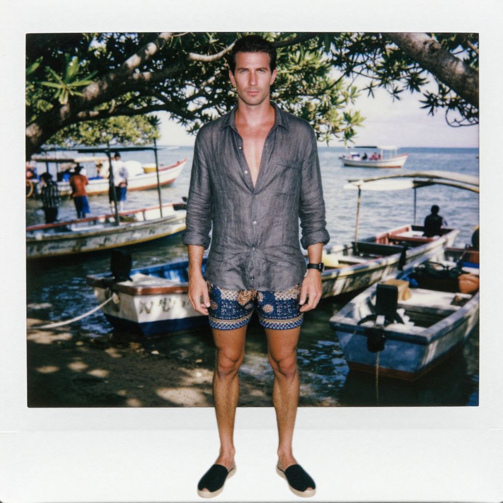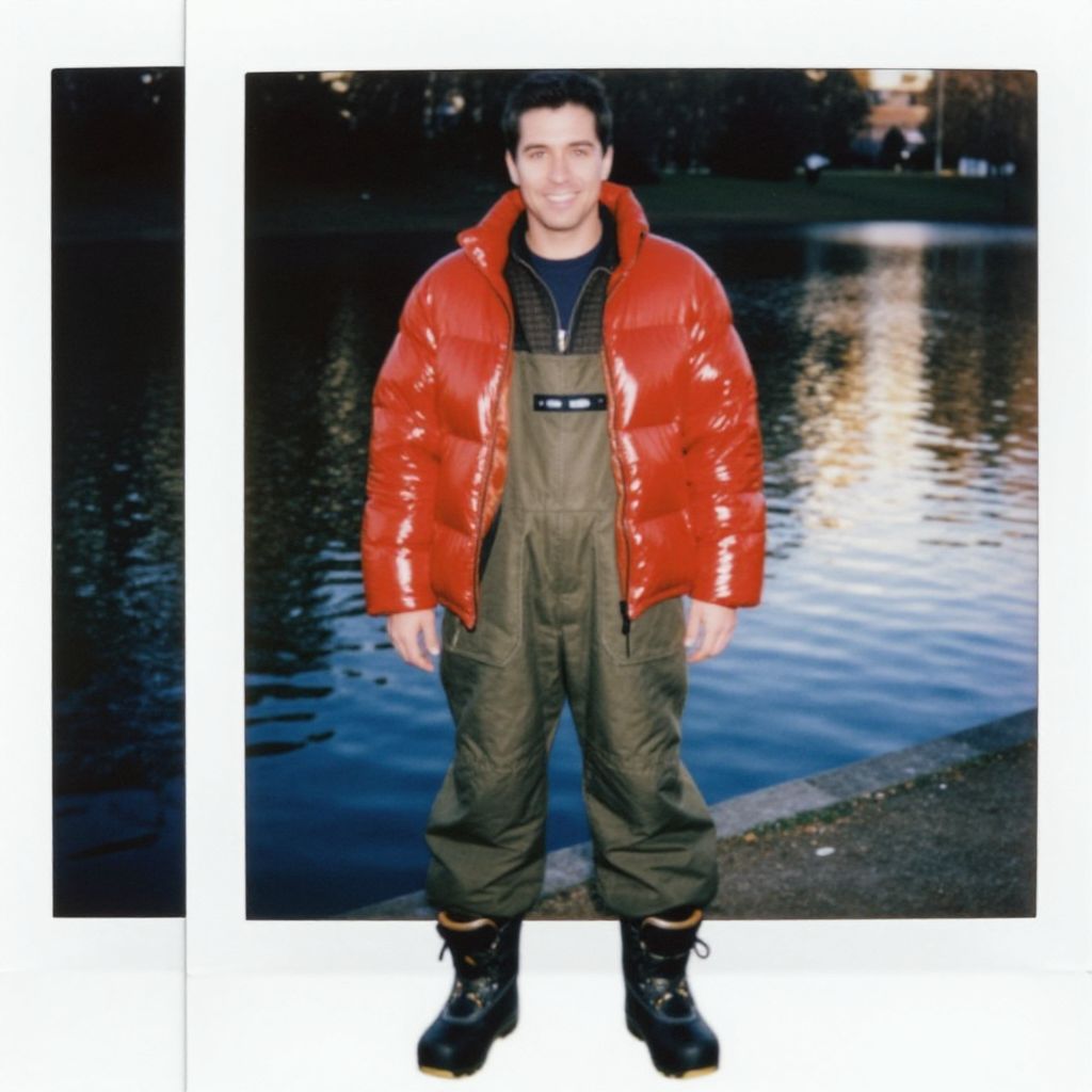 A man, black fitted tank top, red bomber jacket, white mesh shorts, vibrant blue tennis sneakers, weathered wooden docks, polaroid instant camera style, relaxed smile, casual confidence Man has masculine face and piercing eyes