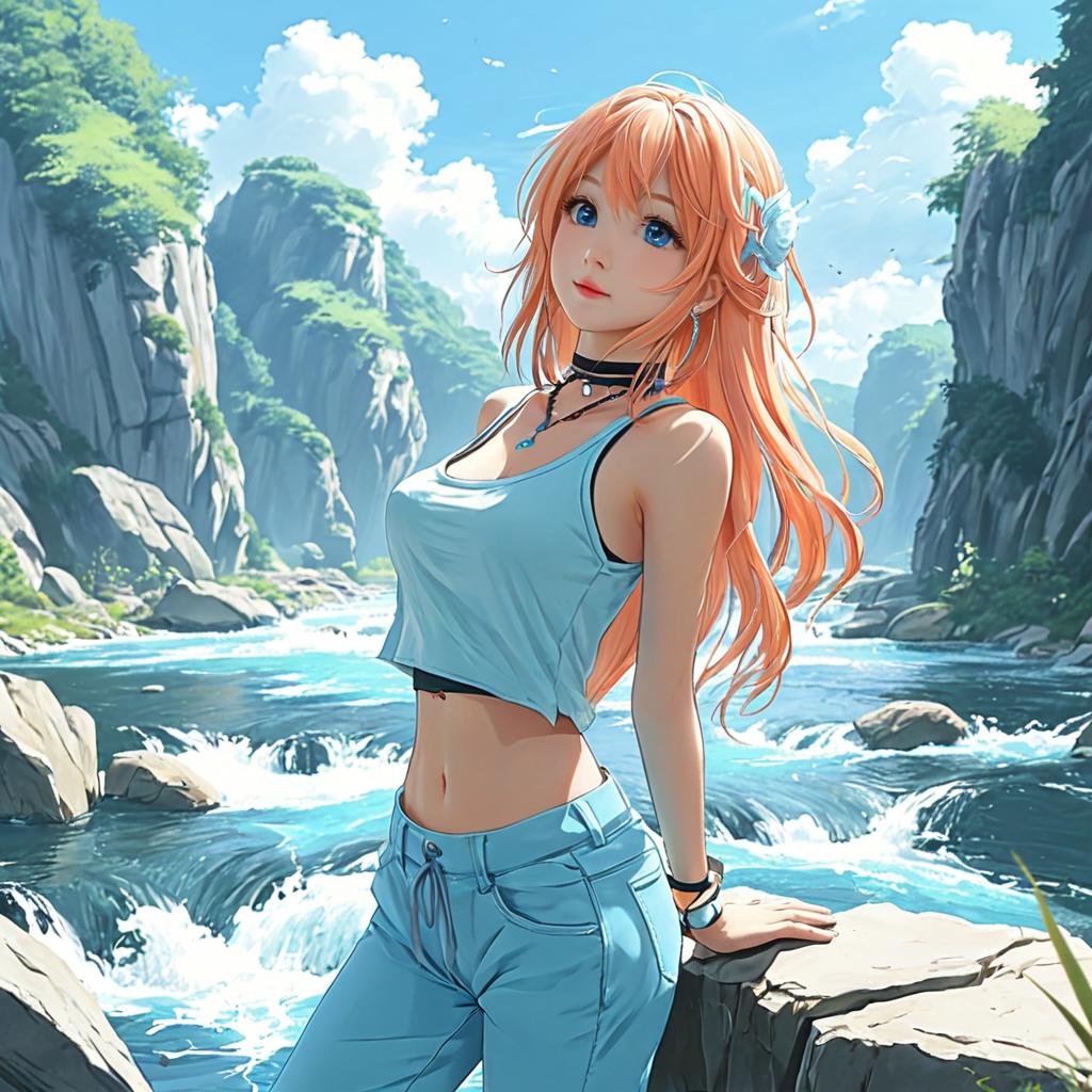 Anime, 1girl, solo, light blue, peach, long, one side up hair, hair, tank top cropped pants choker, fantasy rivers daytime, whole body