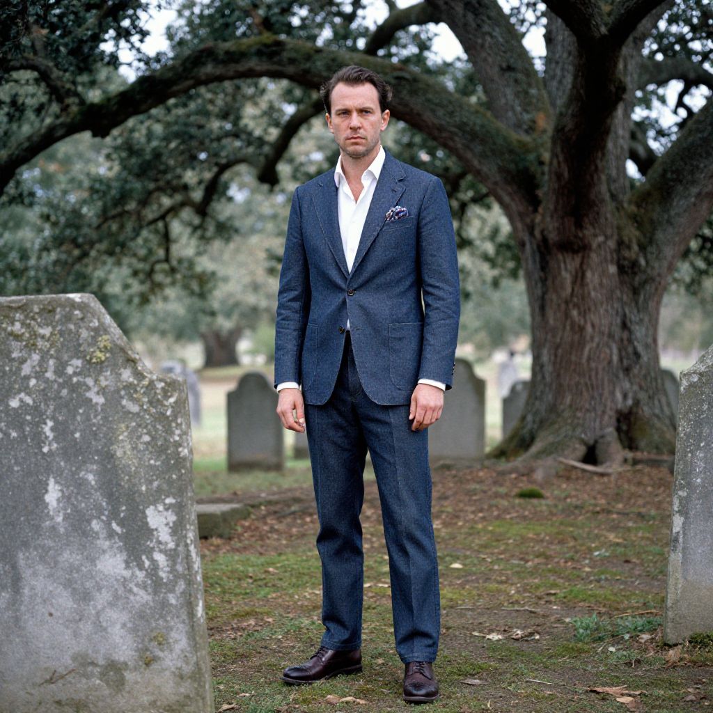A man, midnight blue denim suit, patterned silk pocket square, fitted white dress shirt, dark brown brogues, standing under ancient oak trees, weathered stone tombstones, soft moss underfoot, eastman film stock, contemplative expression, soft light filtering through leaves. Man has masculine face and piercing eyes