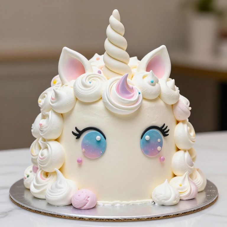 A whimsical unicorn cake defies reality with its spiraling horn, fluffy meringue mane, and dreamy facial features, transforming a simple dessert into a magical, fantastical creation.