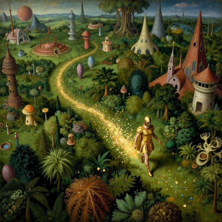 Craft an image in the fantastical style of Bosch's \"The Garden of Earthly Delights,\" viewed from a distinctive aerial viewpoint over a vast, surreal landscape. This scene should meld whimsy and horror as verdant forests intermingle with perplexing structures, forming a dreamlike world. Amidst this peculiar terrain, a solitary figure clad in an elaborate golden attire traverses the foliage gracefully, their face hidden beneath a helmet reminiscent of ancient Greek armor. As they advance, they leave behind a path of luminous petals that sway delicately to the breeze, bathing the scene with an otherworldly radiance and instilling a sense of awe intertwined with apprehension.