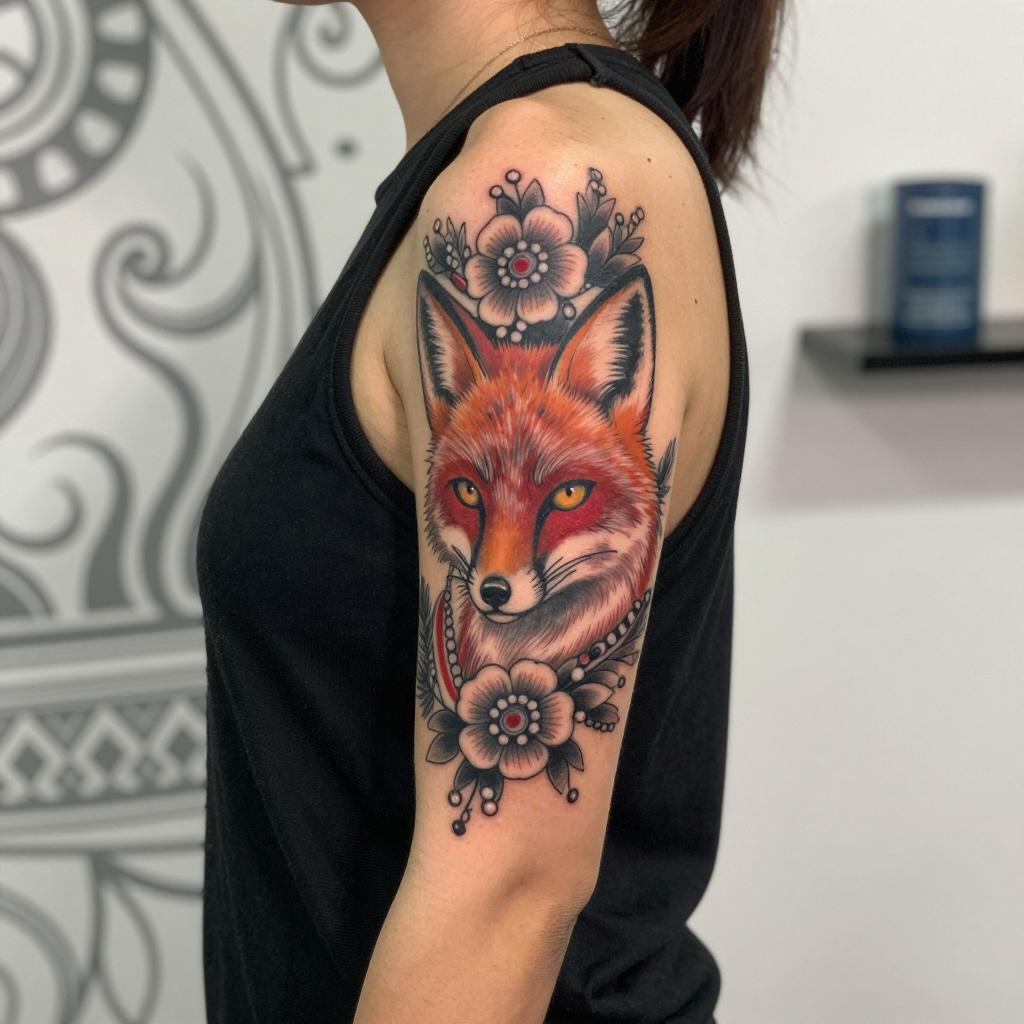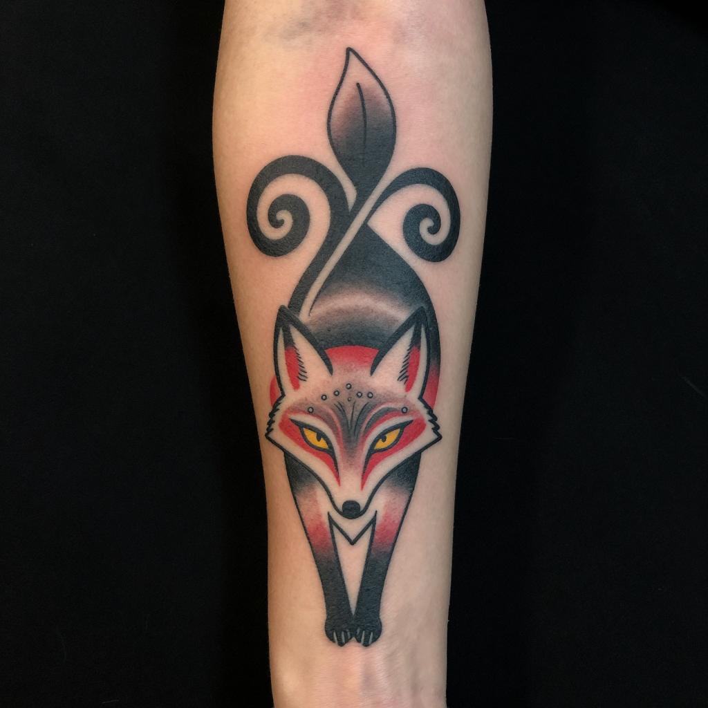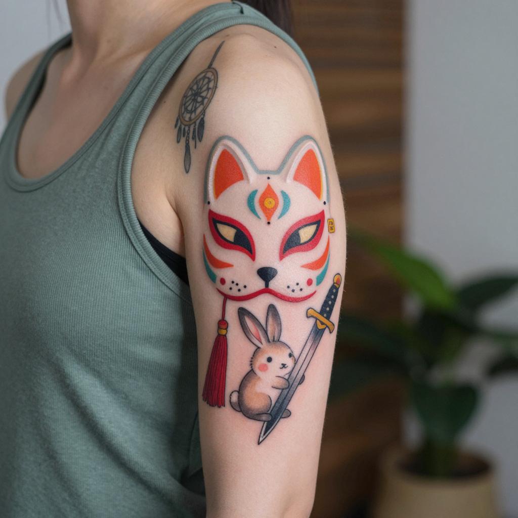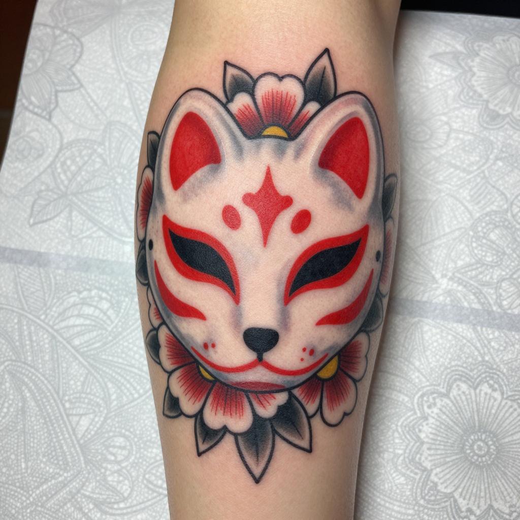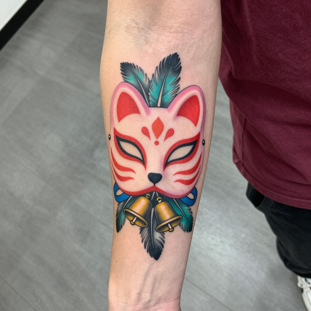 Tattoo on a person's forearm. A pink fox mask with red markings and blue ribbon-like elements, featuring two golden bells and teal feathers. The person wears a maroon sleeve, visible on the right. Background includes a gray floor.