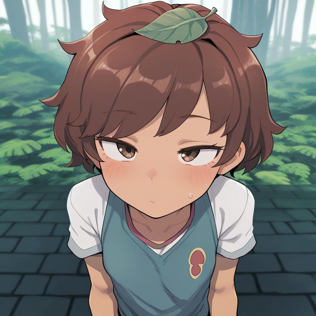 Close-up illustration of a dark-skinned anime girl with short brown hair and brown eyes. She is wearing a blue sleeveless top over a white shirt and has a green leaf resting on her head. The background features a blurred outdoor setting with green foliage and a stone pathway.