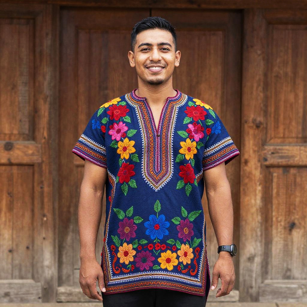 A cheerful man dressed in a vibrant, colorful tunic featuring intricate floral patterns. He stands confidently in a wooden setting, exuding warmth and cultural richness. The photograph captures the essence of traditional attire merged with a contemporary backdrop, showcasing a celebration of heritage.