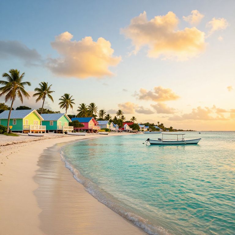 Bahamian coastal village at sunset, vibrant pastel-colored houses along palm-lined beaches, crystal clear turquoise waters, traditional fishing boats gently rocking, warm golden light, soft clouds in sky, peaceful tropical paradise vibe, detailed and vivid style