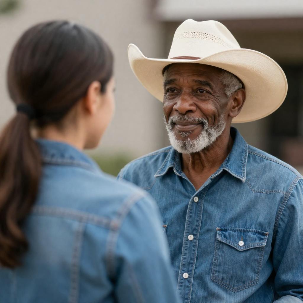 Photograph of an elderly Black man with dark skin, gray hair, and a gray beard. He wears a wide-brimmed beige cowboy hat and a light-colored shirt. Background features blurred trees and greenery. He looks slightly to the side with a gentle expression. Natural light illuminates his face.