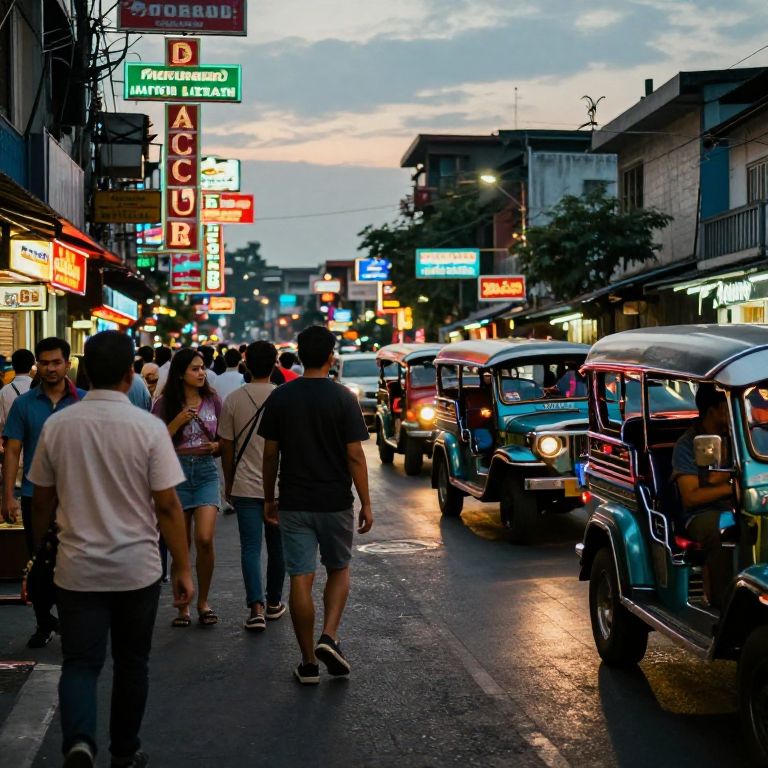 Recto Avenue at dusk, neon signs glowing in the twilight, crowded with people wearing casual modern clothes, jeepneys and tricycles parked along the busy road, textured pavement reflecting light, atmosphere filled with energy and local culture, cinematic urban vibe.