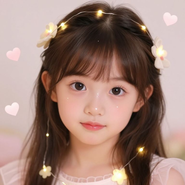 Diameter a beautiful ,cute ,sweet,kawaii little girl with big soulful eyes, 8k, hdr, fairy lights, hearts, kawaii, glitter, flowers, photorealistic, very detailed.,