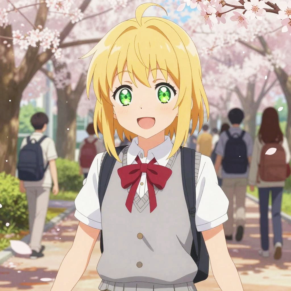 Blonde hair anime character in a vibrant school setting, cheerful expression with sparkling green eyes, wearing classic school uniform with a red ribbon, cherry blossoms gently falling around, bright daylight with soft shadows, colorful and detailed background filled with students and nature.