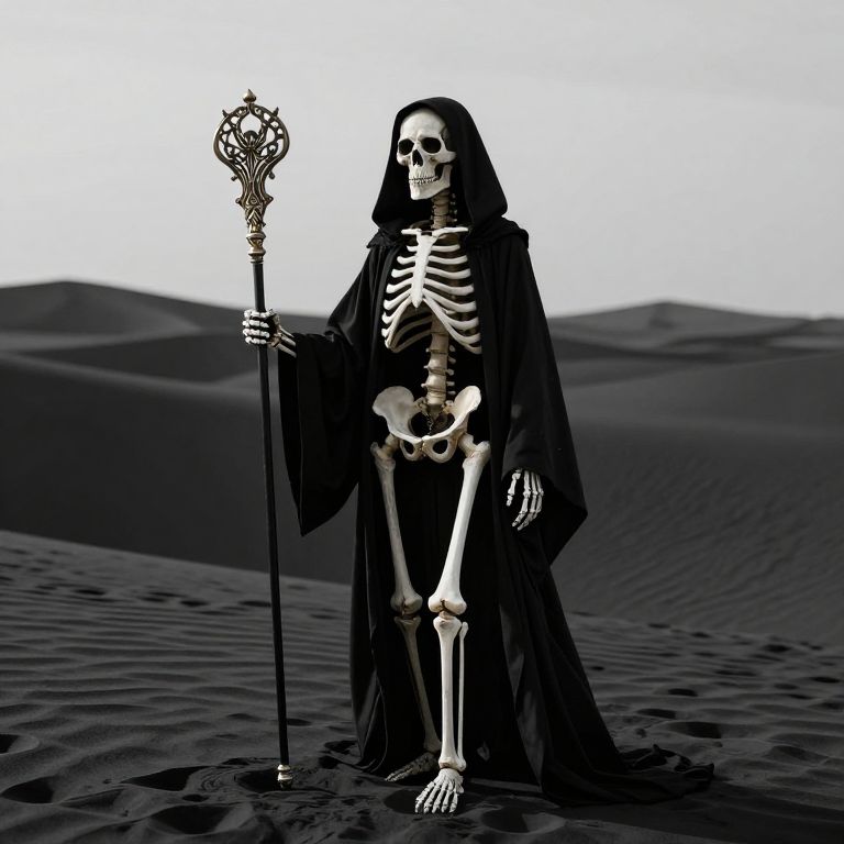 A black cloaked skeleton stands in a desert of black sand, holding a ornate staff, with an Art Nouveau design.