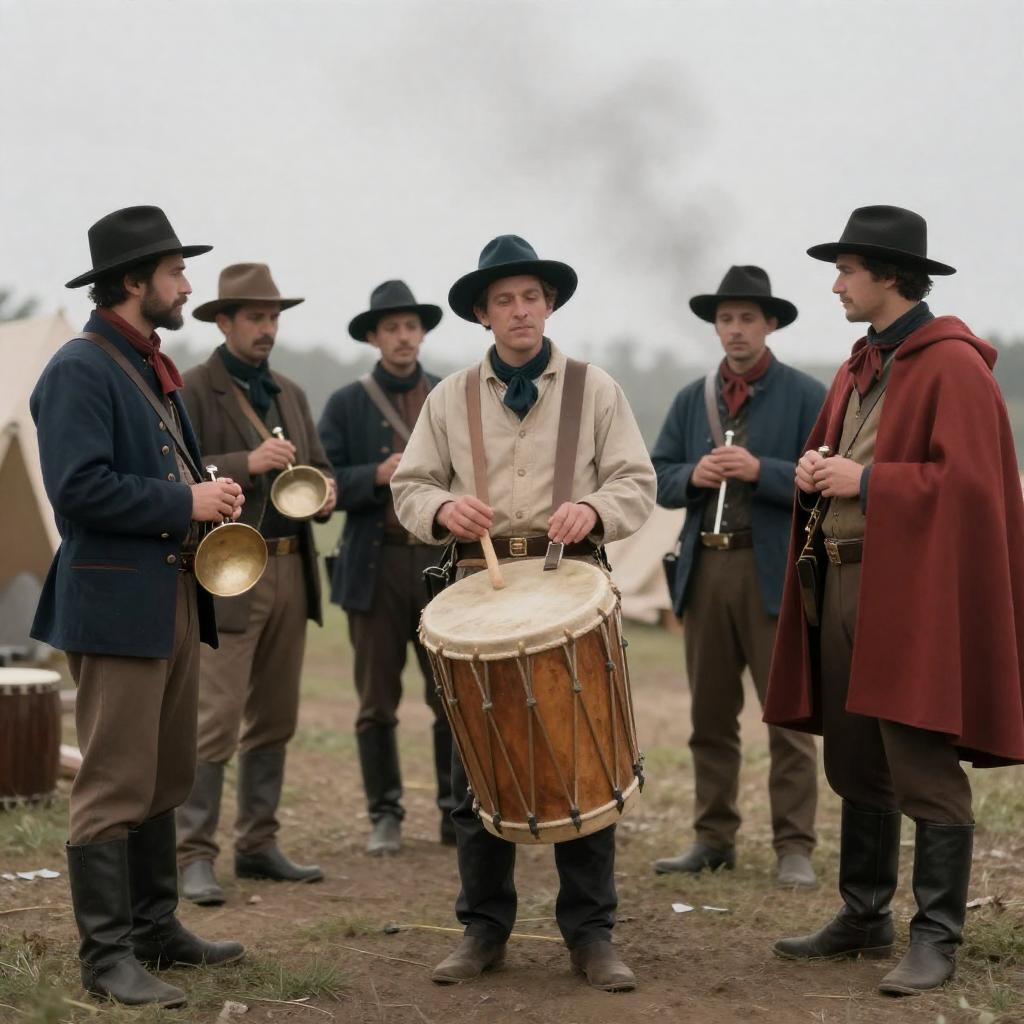 Photograph of a group of six men in 19th-century Western attire, standing outdoors with a campsite in the background. The man in the center plays a large, worn drum, while others hold various instruments and wear hats. One man in a red cloak stands to the right. Smoke rises in the background.