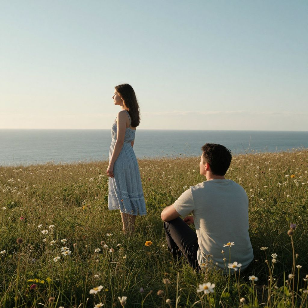 Amidst the whispering embrace of wildflowers and the gentle hum of a distant sea, a woman stands poised in serenity, her silhouette bathed in the soft light of a summer day, while a man sits in quiet anticipation, their shared moment suspended between the promise of connection and the infinite possibilities of the open horizon.