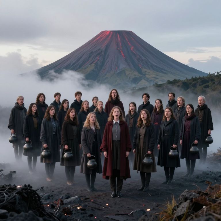 Photograph of a group of 21 people, mostly young adults, standing in front of a volcanic mountain with a red glow at its peak, shrouded in mist. They are dressed in dark, medieval-style clothing, holding metal buckets. The group includes men and women with varied hair colors and lengths. The background features a cloudy sky and rocky, blackened terrain. The atmosphere is moody and somewhat eerie, with the mist and volcanic light adding dramatic contrast. The image evokes a sense of historical or fantasy setting.