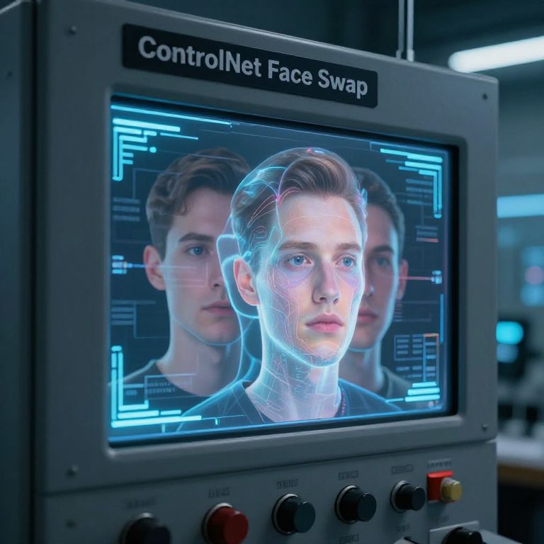 Close-up of a control panel labeled 'ControlNet Face Swap' projecting holographic faces merging seamlessly, sci-fi laboratory environment with glowing screens, high-tech aesthetics, photorealistic textures, subtle lighting effects capturing digital transformation