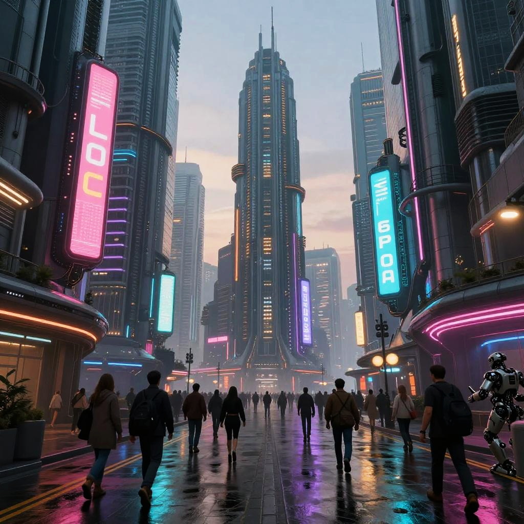 S&c themed futuristic cityscape at dusk, neon lights reflecting on wet streets, intricate details in cyberpunk architecture, bustling crowd with a mix of humans and robots, vibrant colors with a hint of dystopian atmosphere, ultra-realistic rendering