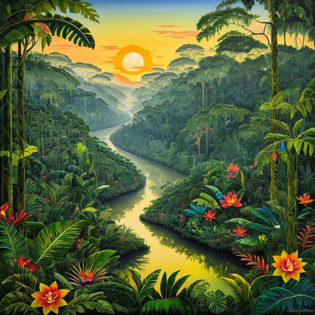 Fine detail painting of the Amazon rainforest at dawn featuring dense tropical foliage, vibrant orange and pink flowers, and a winding river surrounded by lush greenery. The scene captures intricate and ornate elements in the style of Frida Kahlo, emphasizing a harmonious blend of natural beauty and artistic symbolism with a glowing sunrise in the background.
