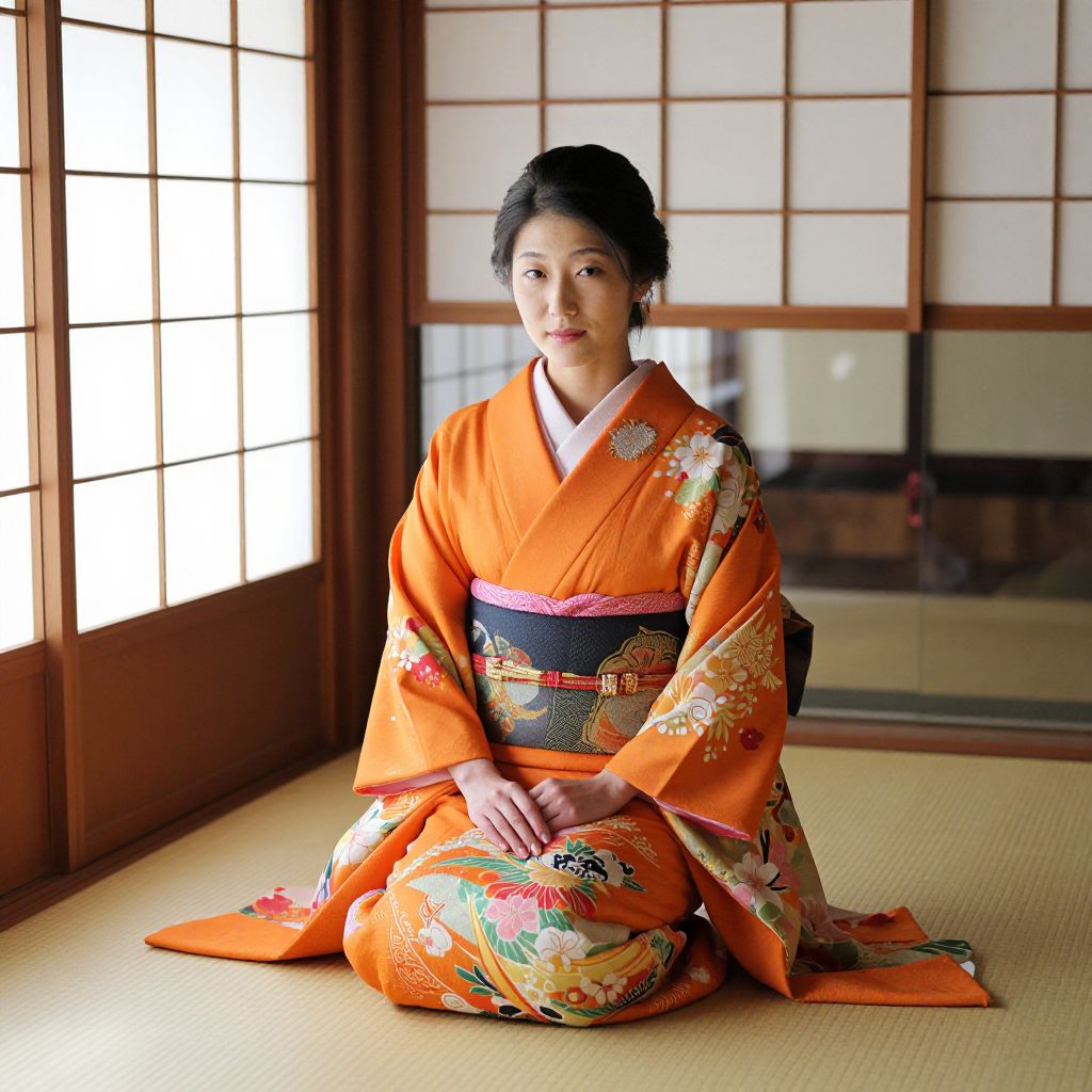 Seated gracefully in a traditional Japanese tea house, a woman adorned in vibrant orange kimono with floral patterns and a dark obi belt exudes elegance, surrounded by wooden shoji screens and natural light streaming through the windows.