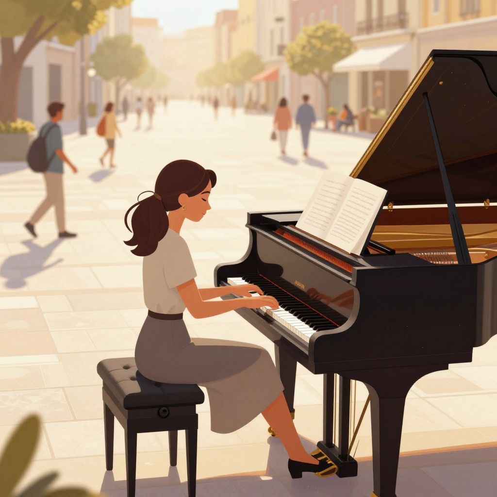 A serene digital illustration captures a woman playing a grand piano in a sunlit plaza, surrounded by strolling pedestrians and illuminated by golden-hour lighting, creating a harmonious blend of realism and artistic ambiance.