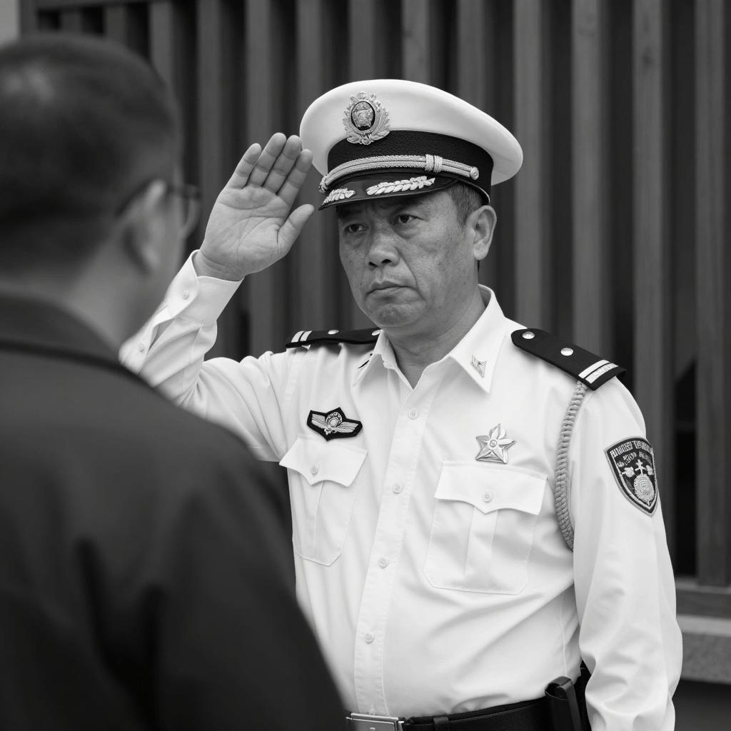 A military group outdoors. Uniformed soldiers with gray caps, gray shirts, and green pants sit in a straight line on the left. One officer stands on the right, facing them, wearing a gray uniform with badges. Clear sky and distant buildings in the background. 10 soldiers, 1 officer. Soldiers have neutral expressions. Officer has a serious expression. Soldiers hold their hands in front of them.