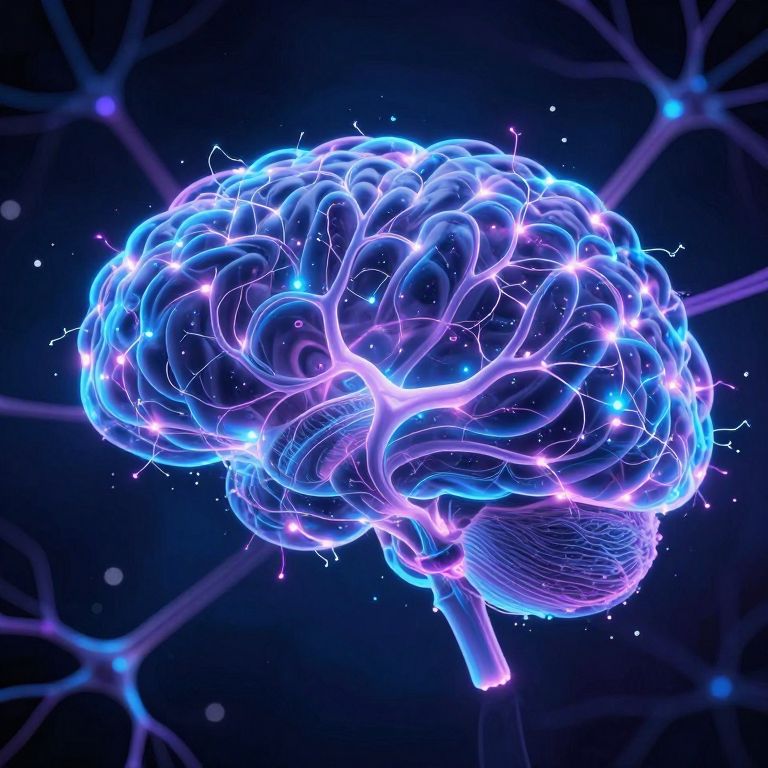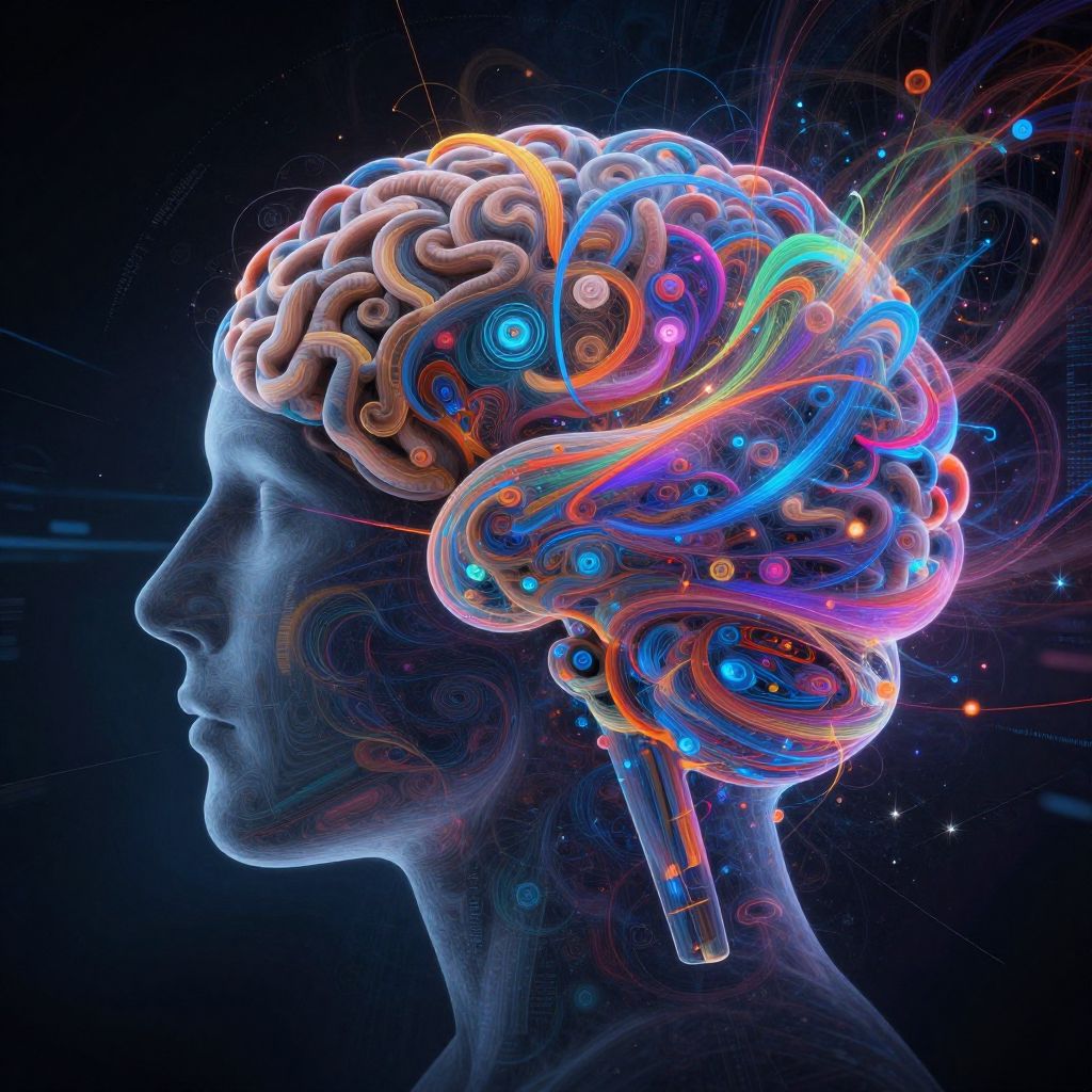 Psicolo visualization of a psychological landscape, a figure standing on a path winding through layers of brain structures, neurons glowing softly, mixed media style with a focus on textures and depth, calming blues and greens.