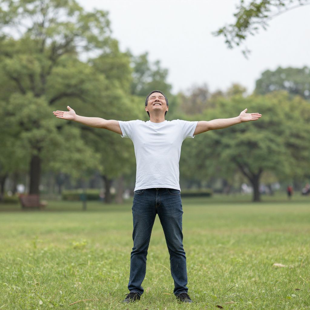 A joyful man with his arms spread wide stands in a tranquil park, basking in a moment of freedom and happiness.