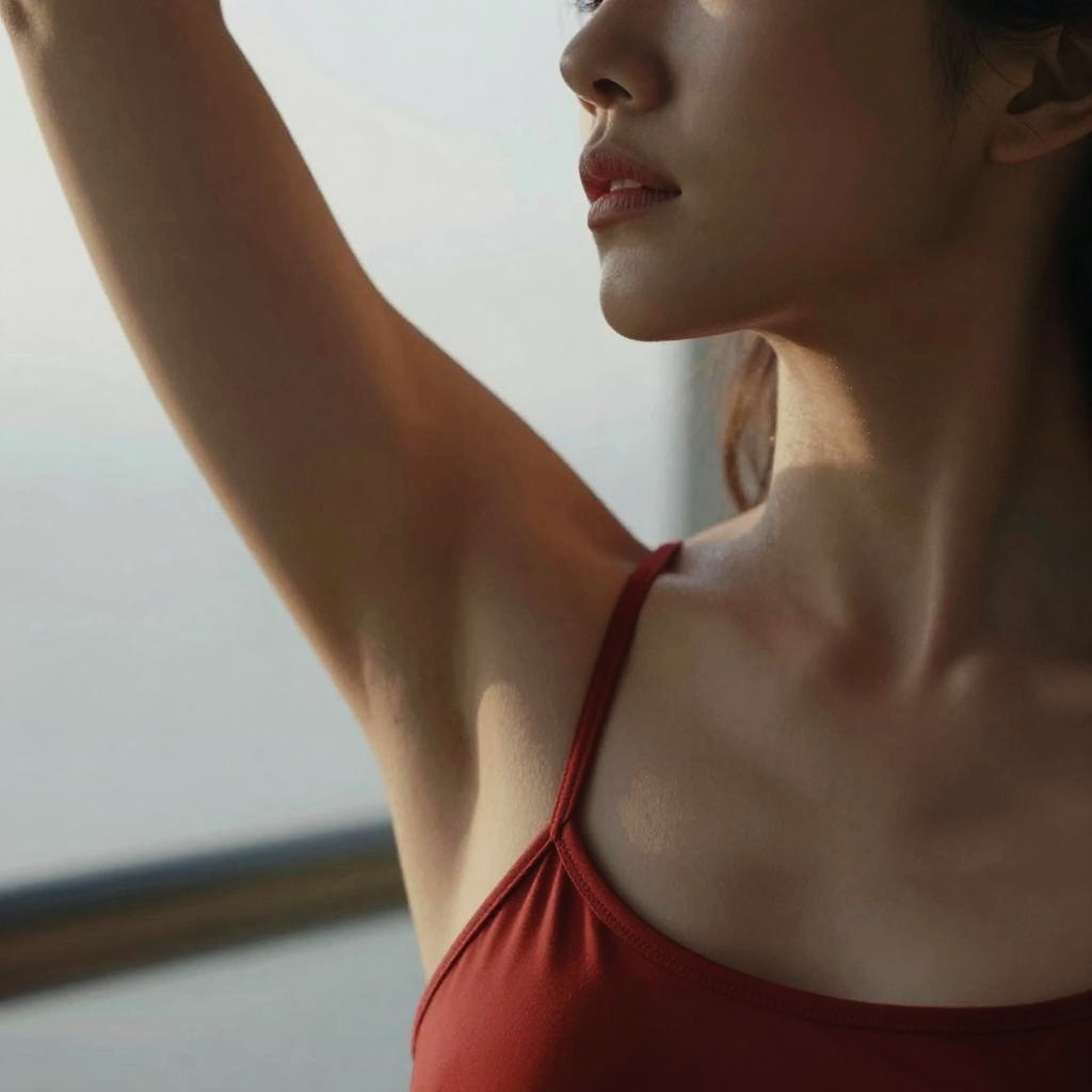A woman, good hand, 4k, high-res, masterpiece, best quality, head:1.3, ((Hasselblad photography)), finely detailed skin, sharp focus, (cinematic lighting), collarbone, morning, soft lighting, dynamic angle, [:(detailed face:1.2):0.2], armpit crease, thigh gap, red clothes, slender, medium breasts, cleavage