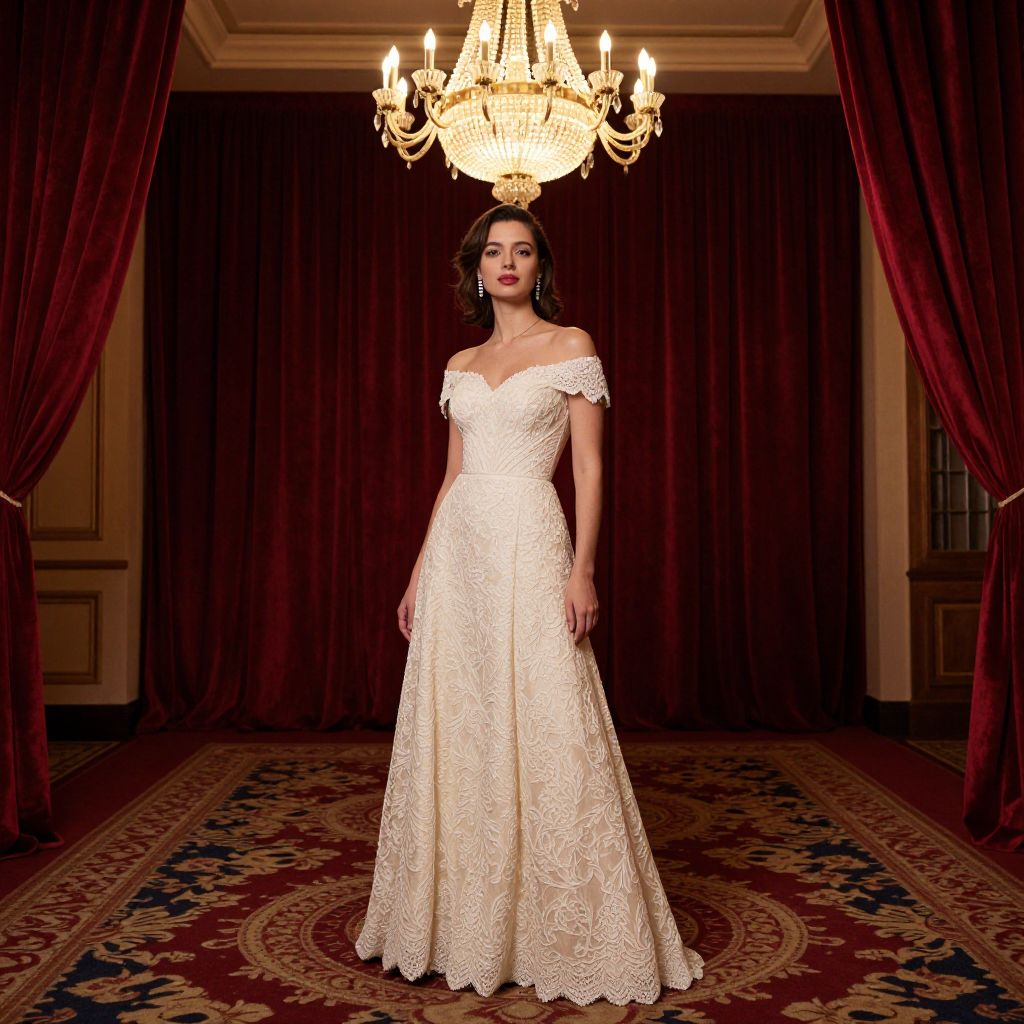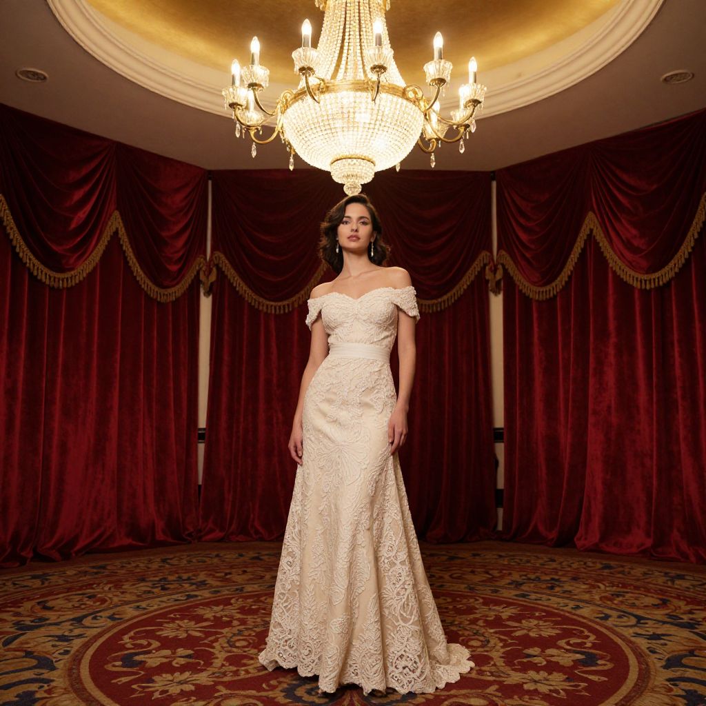 Photograph of a young woman with medium brown skin and dark brown hair, styled in an elegant updo, standing in a luxurious room. She wears an off-the-shoulder, white lace wedding gown with intricate floral patterns, a fitted bodice, and a flowing skirt. She stands centered in front of a large, ornate chandelier with glowing bulbs, casting a warm light. The background features deep red, heavy drapes and an elegant, patterned red and blue carpet. The room's walls have classic paneling, adding to the opulent setting. Her expression is calm and poised.