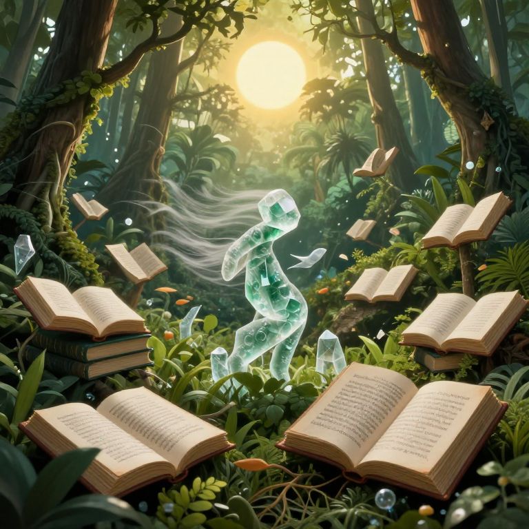 Digital fantasy artwork of a glowing, translucent, ethereal figure dancing among floating books in a lush, sunlit forest.