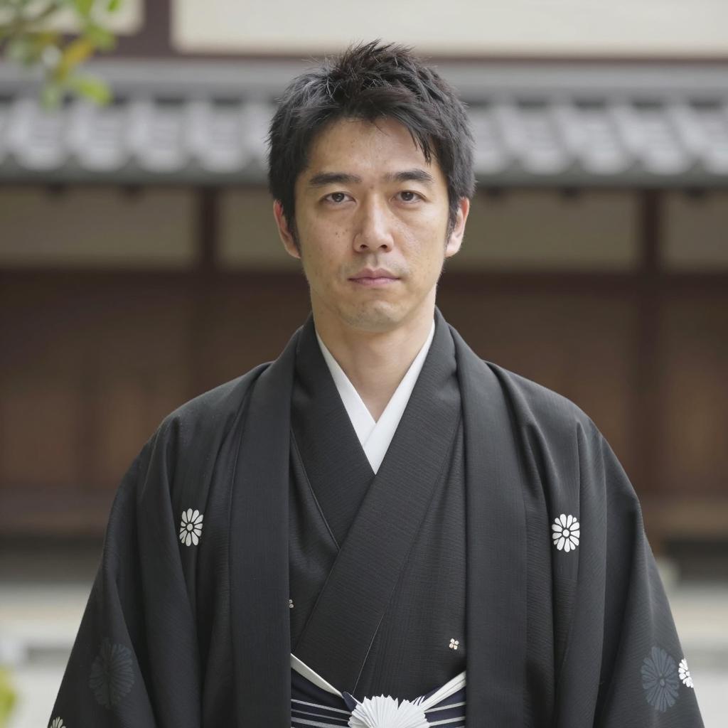 Portrait of an Asian man with short black hair dressed in a black traditional Japanese kimono featuring white floral crests and a white collar, standing outdoors in front of a blurred traditional Japanese building. The image is taken in soft daylight, showcasing a close-up view with a neutral expression and realistic style.