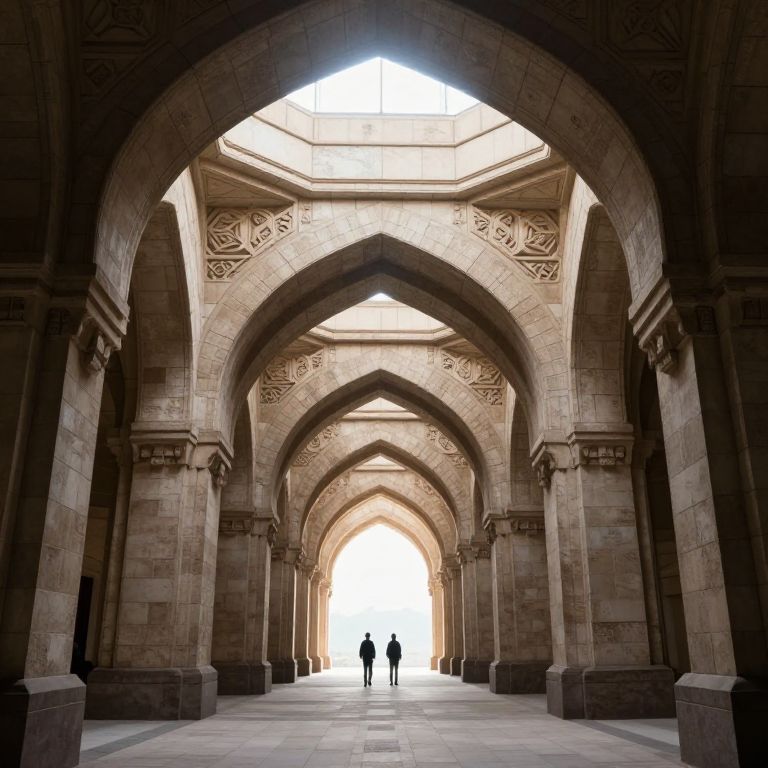 Marble arches stretch endlessly, their intricate patterns casting dappled light as visitors stroll through the grand corridor, their silhouettes blending with the timeless elegance of the structure.