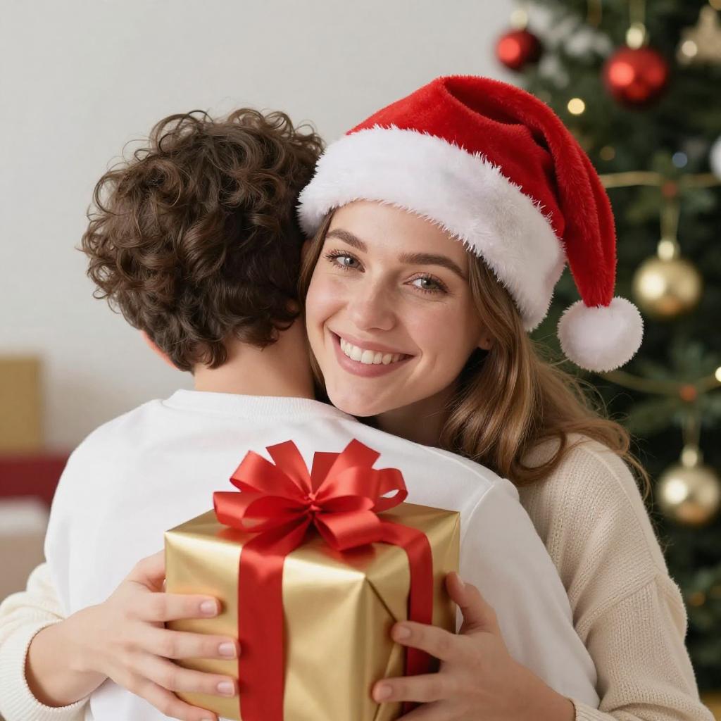 Photograph of a smiling woman with light brown skin and dark brown hair in a white tank top, looking up at the camera with wide eyes and an open mouth, holding a red gift box with a gold bow. Taken from a high angle, the background is bright and blurred, emphasizing the woman and gift. Soft, even lighting with a shallow depth of field.