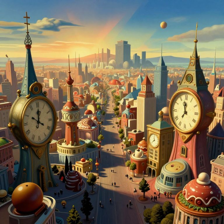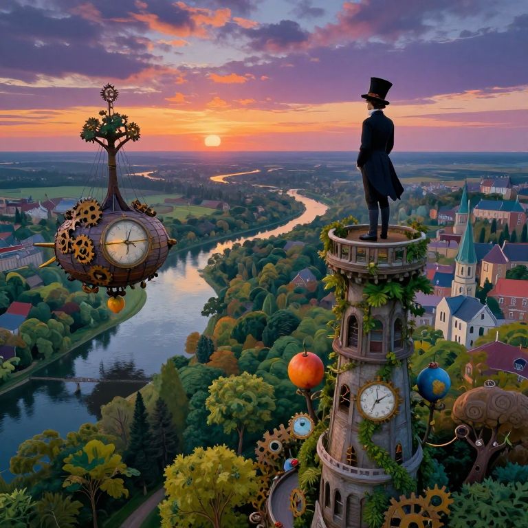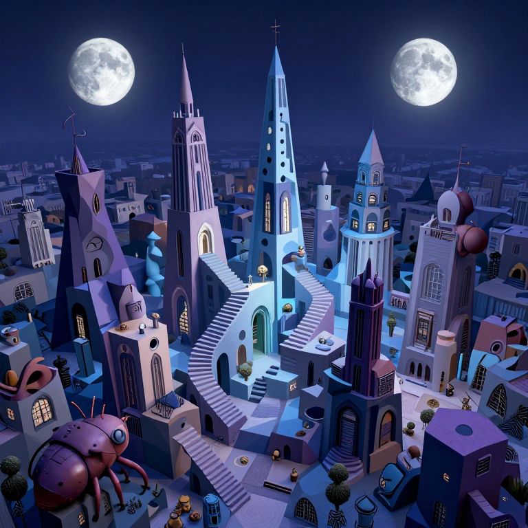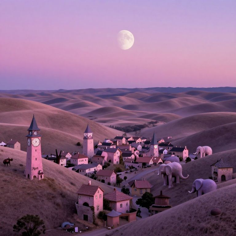 Craft an image reminiscent of surreal landscapes, portraying a village from a bug's perspective nestled in undulating hills within a dreamlike valley. The village architecture includes houses with towers resembling melting clocks and structures reminiscent of elephants, bathed in a soothing palette of pinks and purples. A moon hangs low, casting a mystical glow over the scene, transitioning from the serene calm of dawn to the unsettling stillness of midnight. This novel viewpoint offers viewers an intimate exploration of this bizarrely beautiful, enigmatic village, evoking a sense of wonder and intrigue.