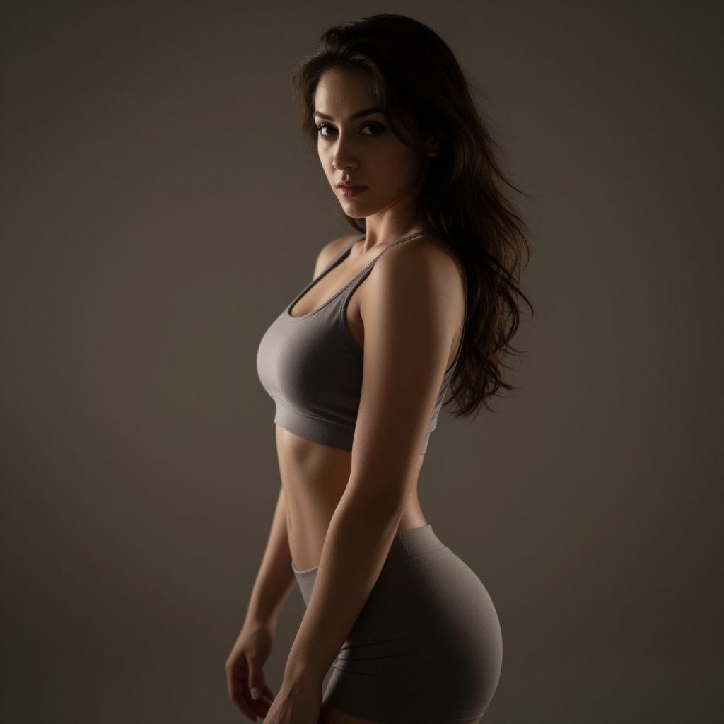 Photograph of a fit, dark-haired woman with long, wavy hair, standing in profile against a dark gray background. She wears a gray sports bra and matching high-waisted leggings, highlighting her toned midriff and curvy hips. The lighting casts shadows that accentuate her athletic build and defined muscles. Her expression is serious, with a slightly parted mouth. The image has a dramatic, high-contrast style with a focus on her strong, feminine physique. The background is plain, keeping the attention on her.