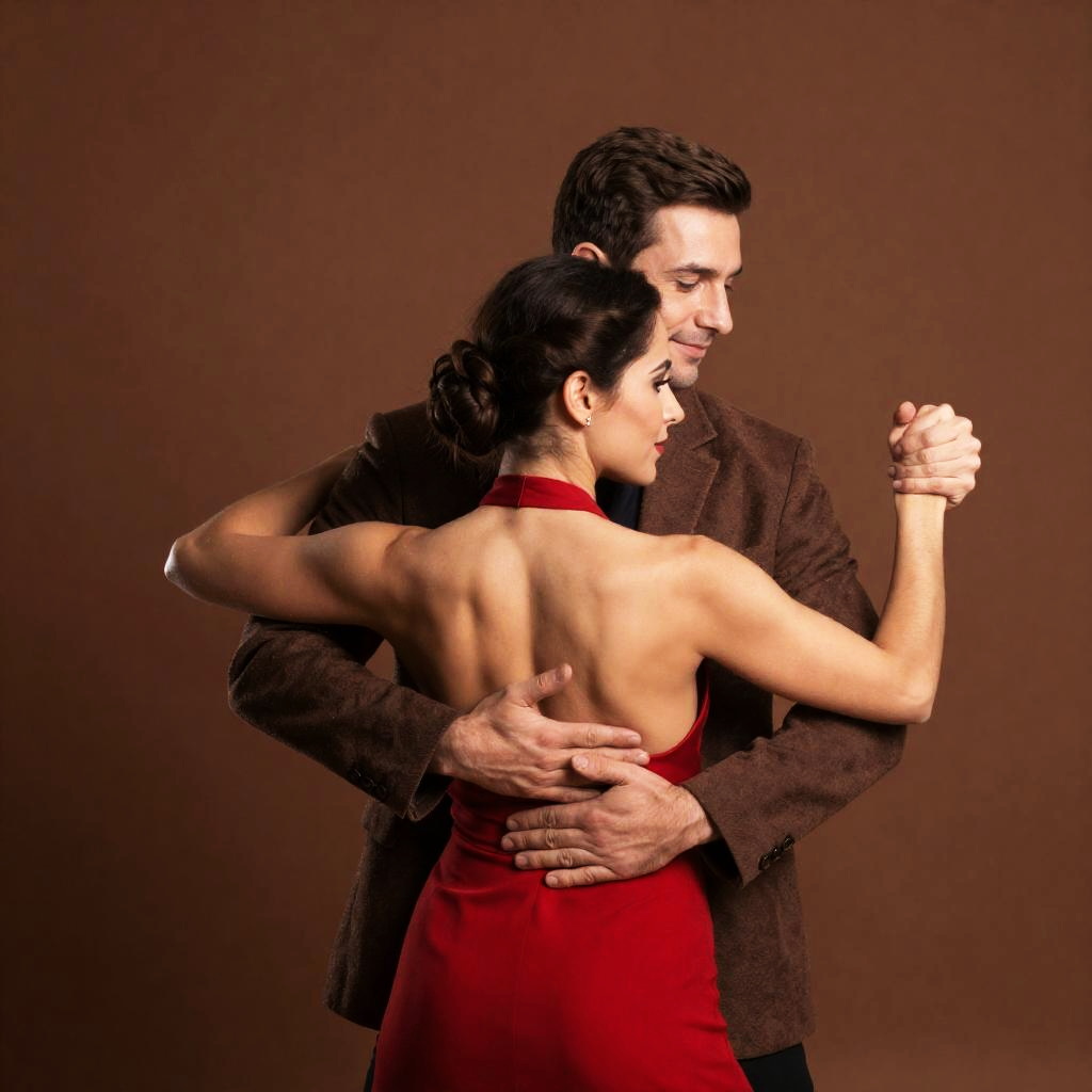 Photograph of a man and woman dancing. Man in dark suit, striped tie, smiling. Woman in white ruffled dress, leaning into him, smiling. Background: red draped fabric, small Christmas tree, woman in blue dress, string lights.