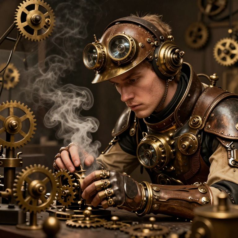 Close-up of kameron as a steampunk inventor in a cluttered workshop filled with brass gadgets and gears, warm sepia tones, smoke and steam effects, intense focused expression, detailed mechanical background, industrial fantasy style.