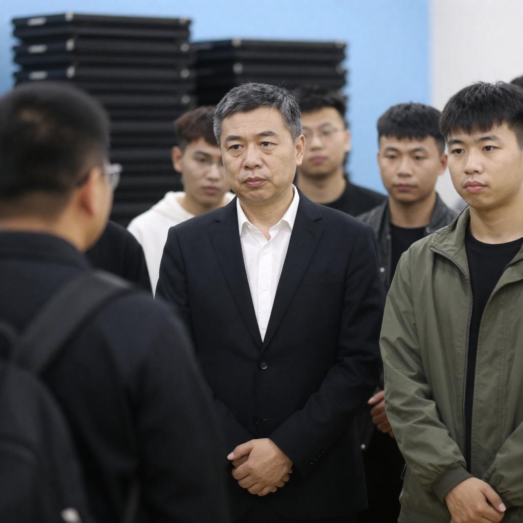 Photograph of a crowded indoor setting with a middle-aged man in a black suit and white shirt standing in the center, surrounded by several young men in casual clothing. The background features stacks of black equipment and a blurred blue wall. One young man in a green jacket stands to the right, looking forward.