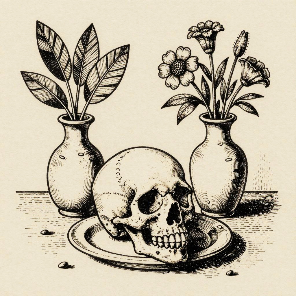 This is a black-and-white, vintage-style ink drawing on beige paper. It features a still life with a skull on a plate in the foreground, surrounded by two vases—one with tall leaves and the other with flowers. The detailed line work gives a textured, almost woodcut look, with the vases and plants creating a balanced composition. The background is plain, keeping focus on the central objects.