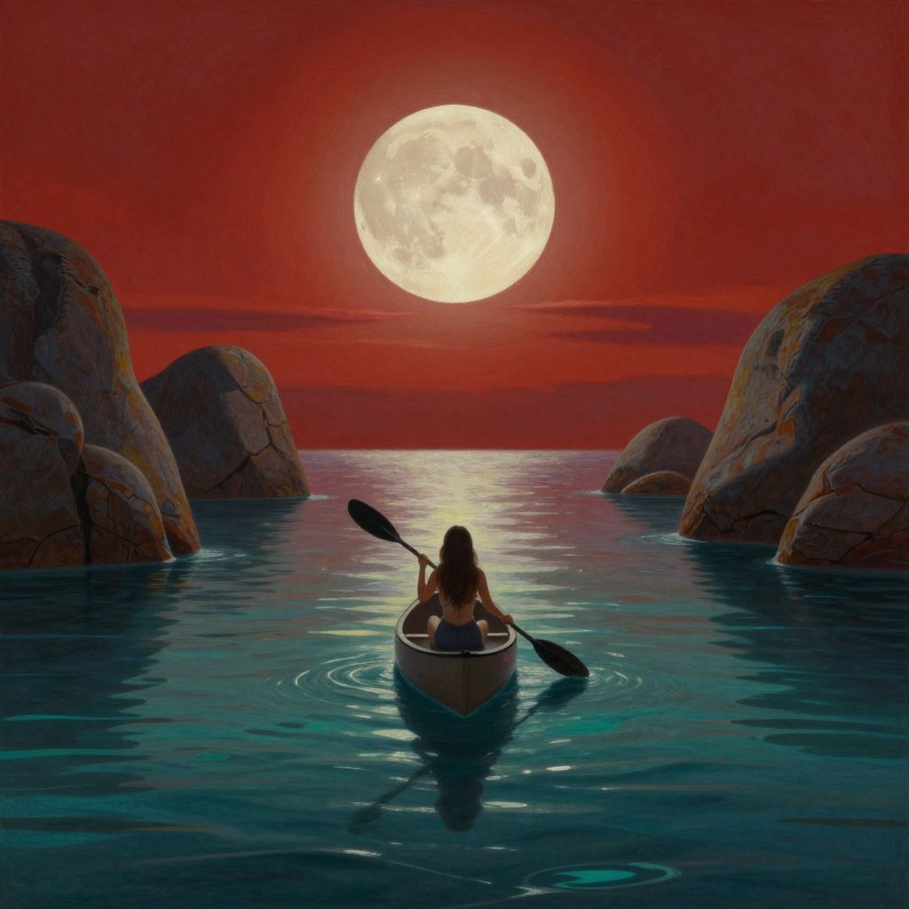 A captivating, dramatic scene in a painting that exudes mystery and foreboding, A fiery red sky, swirling clouds, and a crescent moon illuminate a solitary woman standing near the water's edge, Her long dress flows in the wind, silhouetted against the eerie glow, The water mirrors the fiery sky and moonlight, amplifying the uneasy atmosphere, The composition emphasizes the woman's isolation and vulnerability, with her outstretched arms reflecting longing or despair, This vibrant, cinematic work of conceptual art creates a haunting impression, conceptual art, painting, vibrant, cinematic, a group of white geese walking in a single file along