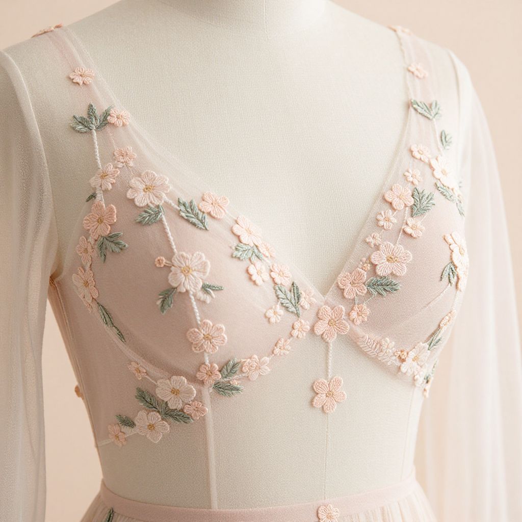 Decolletage adorned with delicate floral embroidery on a sheer fabric, set against a soft pastel background, romantic and whimsical mood with gentle natural lighting, emphasizing the intricate details and the elegance of fine craftsmanship in haute couture.