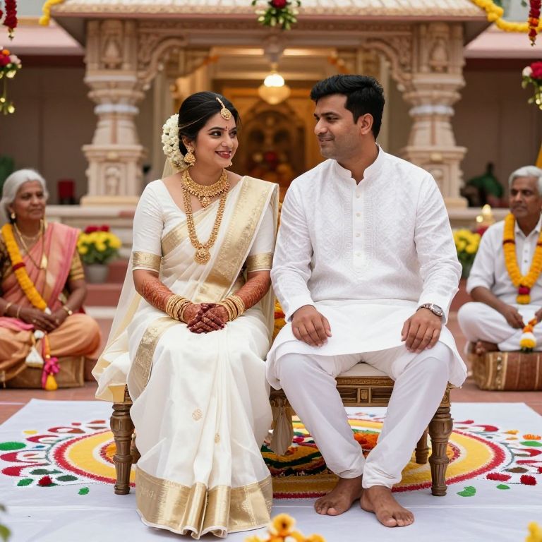 A realistic photography of a traditional Hindu marriage ceremony in a grand temple courtyard, featuring a beautiful Indian bride in a pristine white sari with golden jewelry, wearing a traditional mehndi design on her hands and feet, and a groom in a well-tailored white kurta and dhoti, both with warm, expressive faces, surrounded by elders and cultural decor like rangoli patterns and floral arrangements.