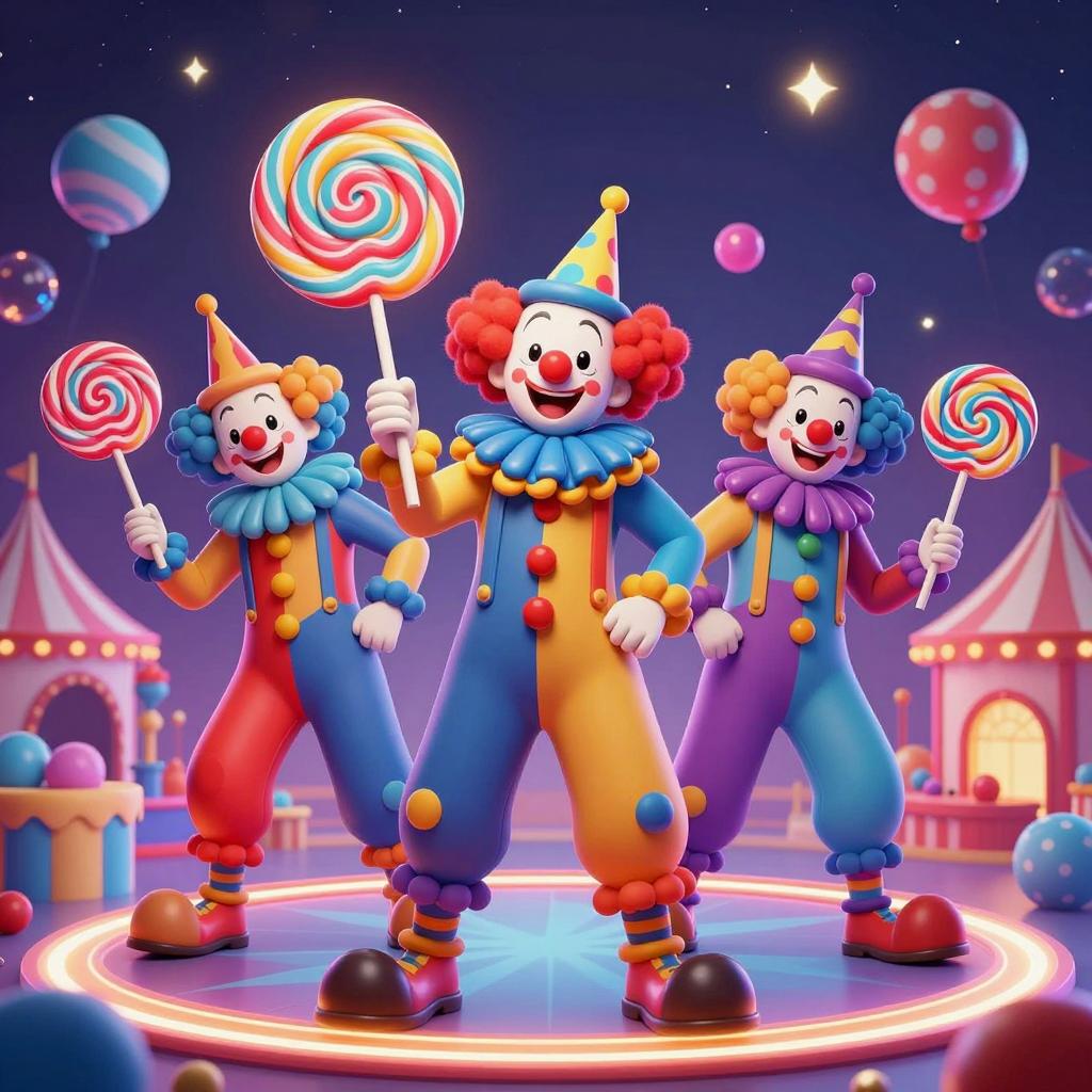 Vibrant digital illustration of three fantasy clowns dressed in radiant, multicolored costumes and conical hats with fluffy collars. They hold large, striped lollipops and stand on a glowing, circular platform within a holographic circus setting under a starry sky. The scene emanates whimsical joy and magical illusions with playful, surreal forms and vivid neon colors.
